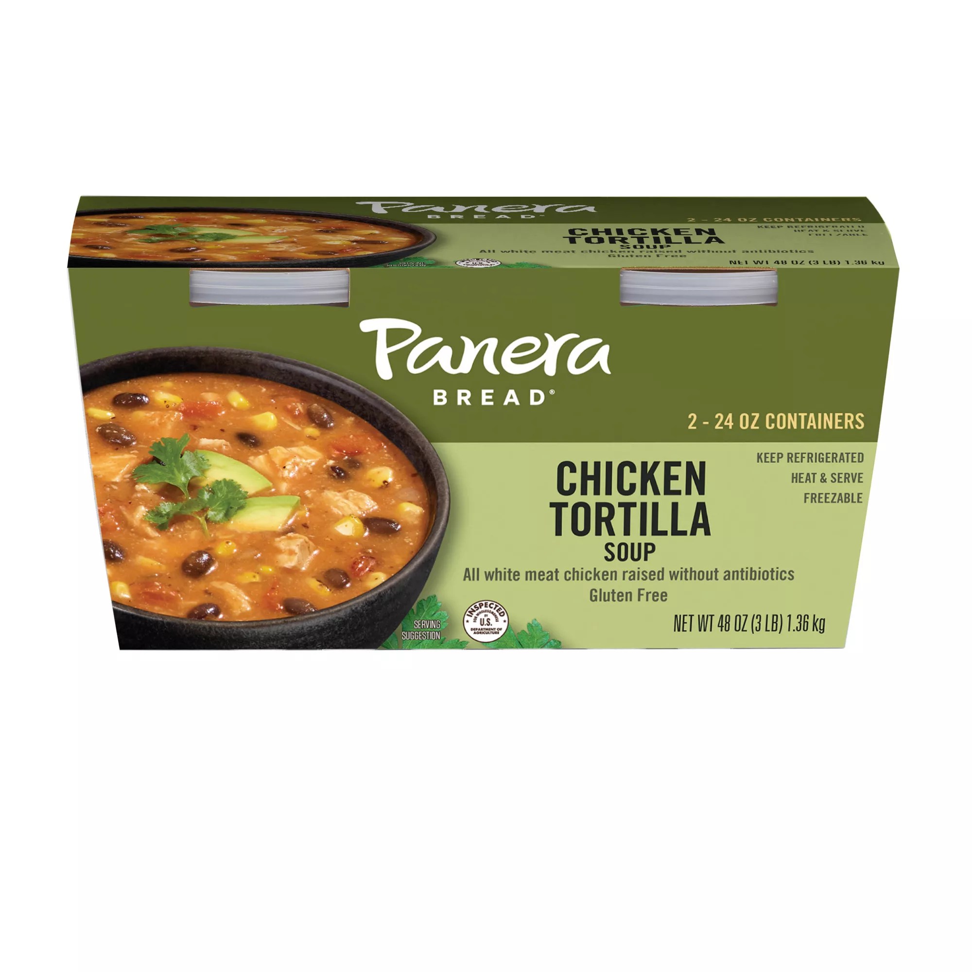 This tortilla soup tastes better than anything you can get at a restaurant. And it's healthy too! Don't let the long list of ingredients fool you. All you do is dump everything into the slow cooker and walk away. Garnish with grated Cheddar, avocados, and a splash of fresh lime juice.Ingredients | Southwest Chicken Tortilla Soup Panera1 pound shredded, cooked chicken1 (15 ounce) can whole peeled tomatoes, mashed1 (10 ounce) can enchilada sauce1 medium onion, chopped1 (4 ounce) can chopped green chile peppers2 cloves garlic, minced2 cups water1 (14.5 ounce) can chicken broth1 teaspoon cumin1 teaspoon chili powder1 teaspoon saltΒΌ teaspoon black pepper1 bay leaf1 (10 ounce) package frozen corn1 tablespoon chopped cilantro7 corn tortillasvegetable oilDirectionsPlace chicken, tomatoes, enchilada sauce, onion, green chiles, and garlic into a slow cooker. Pour in water and chicken broth, and season with cumin, chili powder, salt, pepper, and bay leaf. Stir in corn and cilantro. Cover, and cook on Low setting for 6 to 8 hours or on High setting for 3 to 4 hours.Preheat oven to 400 degrees F (200 degrees C).Lightly brush both sides of tortillas with oil. Cut tortillas into strips, then spread on a baking sheet.Bake in preheated oven until crisp, about 10 to 15 minutes. To serve, sprinkle tortilla strips over soup.Info | Southwest Chicken Tortilla Soup Paneraprep: 30 mins cook: 8 hrs total: 8 hrs 30 mins Servings: 8 Yield: 8 servings